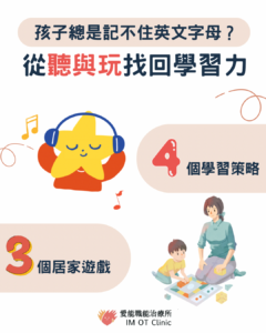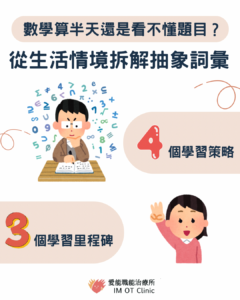 親職文章 我們不定期分享經驗與重要文章,如果您對某主題感到興趣,歡迎聯絡我們 數學算半天還是看不懂題目?陪孩子從生活情境拆解抽象詞彙! 2026/04/15 閱讀更多 英文字母老記不住?從「聽與玩」找回孩子的學習力! 2026/03/19 閱讀更多 拒絕年節大崩潰!3 招適應指南陪孩子社交不心累 2026/02/11 閱讀更多 孩子看長題目就發呆?3面向拆解讀題困難,找回學習掌控感! 2026/02/11 閱讀更多 2026台北市早療資源地圖 2026/02/02 閱讀更多 體制內外教育,哪種才適合孩子?用「周哈里窗」看見孩子的學習需求 2026/01/08 閱讀更多 孩子讀懂了嗎?跨越中低年級「閱讀轉型期」!4 種提升閱讀理解力的互動對策 2026/01/08 閱讀更多 不只是聖誕禮物!用倒數日曆陪孩子在遊戲中學會規劃與合作 2025/12/11 閱讀更多 孩子聽寫考試考不好怎麼辦?掌握這4招有效幫助孩子提升學業表現 2025/12/11 閱讀更多 1 2 3 ... 12 下一頁 » 愛能都可以按照您的需求,透過專業職能活動設計、評估與介入, 來協助您或家人增加獨立生活的能力,進而擁有更好的生活品質、活出最精彩的人生! 與我們聊聊